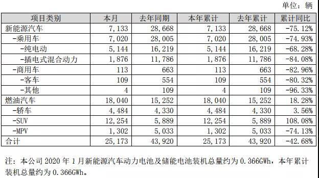 總體來看,1月份,比亞迪汽車總銷量為25,173輛,相較于2019年1月同比減少42.68%。