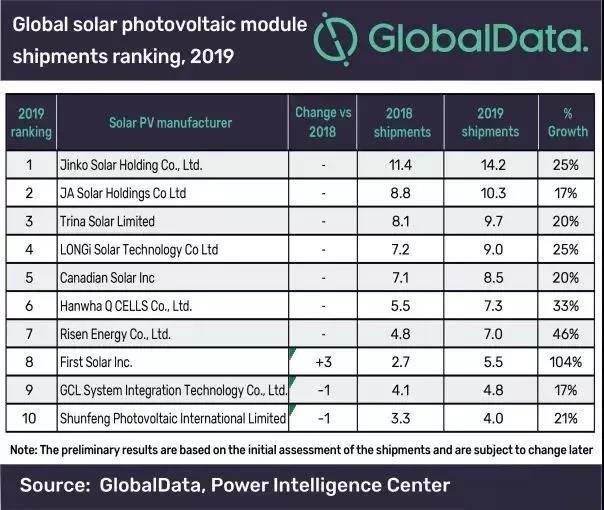 名單上唯一的美國(guó)制造商是FirstSolar,是迄今為止該榜單上所有公司中增幅最大的公司,2019年的發(fā)貨量增長(zhǎng)了104%,從2018年的第十一躍升至2019年的第八,出貨量為5.5GW。