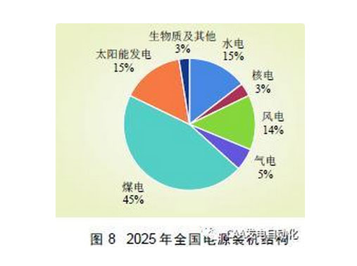 (1)以保障系統(tǒng)安全為前提。深化高比例新能源接入對電力系統(tǒng)運行影響的機理認識,通過技術(shù)和管理手段,多措并舉,保障電力系統(tǒng)安全。(2)將就地、就近利用作為重點。優(yōu)先在用電負荷附近開發(fā)新能源,減少遠距離輸送消納。(3)充分發(fā)揮市場配置資源的作用。統(tǒng)籌中長期和現(xiàn)貨市場、省間和省內(nèi)市場,通過市場手段促進新能源發(fā)展與消納。(4)友好接入,與其他電源相協(xié)調(diào)。提升新能源并網(wǎng)友好性,統(tǒng)籌規(guī)劃抽蓄、火電機組靈活性改造、需求側(cè)響應(yīng)、電化學(xué)儲能等靈活性資源,確保電網(wǎng)調(diào)節(jié)能力與系統(tǒng)備用充足。(5)持續(xù)健全年度預(yù)警機制。加強新能源項目新增規(guī)模管理,深化年度投資預(yù)警和監(jiān)管制度。(6)多能互補、多網(wǎng)協(xié)同。電源側(cè)發(fā)揮風(fēng)光水的出力互補作用,負荷側(cè)高效運用電熱冷氣的協(xié)同特性。綜合分析國家能源轉(zhuǎn)型要求、清潔能源消納目標(biāo)以及新能源成本快速下降等因素,預(yù)計“十四五”期間,全國年度新增光伏裝機容量有望超過4000 萬k W, 年度新增風(fēng)電裝機有望達到2500 萬kW,到2025 年,全國新能源總裝機規(guī)模在7.5 億~8.0 億kW,占全國電源總裝機的26%~28%,發(fā)電量占比約為12%。2025 年全國電源裝機結(jié)構(gòu)如圖8 所示。