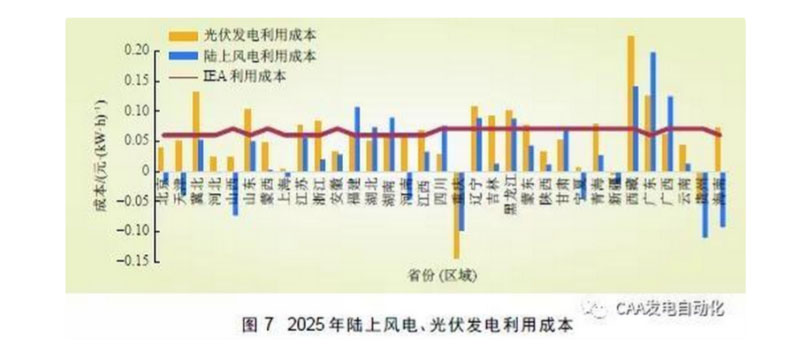 根據(jù)IEA 研究提出的系統(tǒng)成本, 取折中值0.061元/(kW·h)、東部省份不考慮輸電成本進行分析,比對各省光伏發(fā)電、陸上風(fēng)電度電成本與燃煤標(biāo)桿電價之差,2025 年,廣東、福建、遼寧等少數(shù)省份可以實現(xiàn)平價利用,如圖7 所示。但是,考慮到中國為大陸季風(fēng)性氣候、風(fēng)電保證出力相比歐美要低、新能源發(fā)電預(yù)測精度尚有差距、煤電比重高等因素,中國新能源并網(wǎng)帶來的系統(tǒng)成本要比歐美更高,達到平價利用的省份實際上還要少一些。
