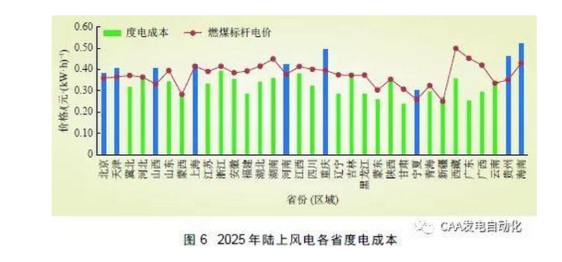 (3)陸上風(fēng)電度電成本。在考慮目前燃煤脫硫標(biāo)桿電價水平不變、未來部分省份(區(qū)域)棄風(fēng)好轉(zhuǎn)、風(fēng)電利用小時數(shù)有所提高等邊界條件下,對2025 年各省陸上風(fēng)電度電成本進行測算,基本在0.24~0.40 元/(kW·h)之間,大部分省份(區(qū)域)陸上風(fēng)電可實現(xiàn)發(fā)電側(cè)平價上網(wǎng)(除重慶、天津、山西等省份(區(qū)域)之外),如圖6所示。另外,根據(jù)測算,2025 年江蘇、廣東的海上風(fēng)電接近平價上網(wǎng)。