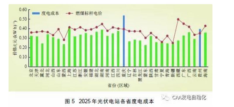 (2)光伏電站度電成本。在考慮目前燃煤脫硫標(biāo)桿電價水平不變、未來部分省份(區(qū)域)棄光好轉(zhuǎn)、光伏發(fā)電利用小時數(shù)有所提高等邊界條件下,對2025 年各省(區(qū)域)光伏電站度電成本進行測算,基本在0.23~0.40 元/(kW·h)之間,絕大部分省份( 區(qū)域) 可實現(xiàn)發(fā)電側(cè)平價上網(wǎng)(除重慶和貴州之外),如圖5所示。