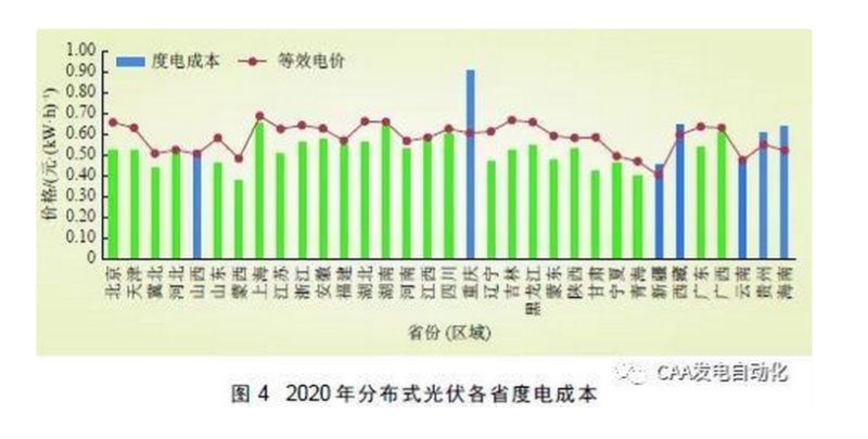 ( 1 ) 分布式光伏發(fā)電度電成本。根據(jù)2018 年各省分布式光伏項目平均利用小時數(shù),按照自用電量占比80%、結(jié)算價格為銷售目錄電價85 折進行測算,2020 年分布式光伏度電成本基本在0.38~0.60 元/(kW·h)之間,大部分省份(區(qū)域)可實現(xiàn)用戶側(cè)平價上網(wǎng)(除重慶、山西、貴州等少數(shù)省份外),如圖4 所示。