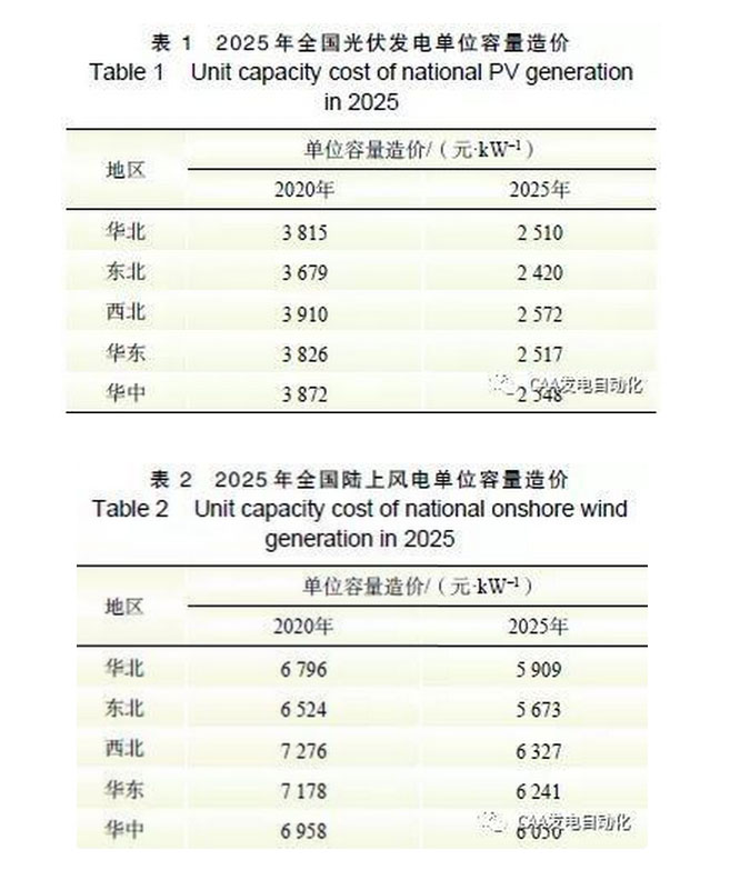 2019 年初以來,作者對多家行業(yè)協(xié)會、研究機構(gòu)、權(quán)威人士和項目業(yè)主開展訪談?wù){(diào)研,結(jié)果表明,未來一段時期光伏發(fā)電和海上風(fēng)電的建設(shè)成本仍有一定下降空間, 陸上風(fēng)電下降空間不大,預(yù)計2020 年中國光伏電站、陸上風(fēng)電和海上風(fēng)電的單位容量造價分別為3800、6900 和14000 元/kW,2025 年有望降到2500、6000 和12000 元/ kW,不同地區(qū)光伏發(fā)電和陸上風(fēng)電造價分別如表1 和表2 所示。