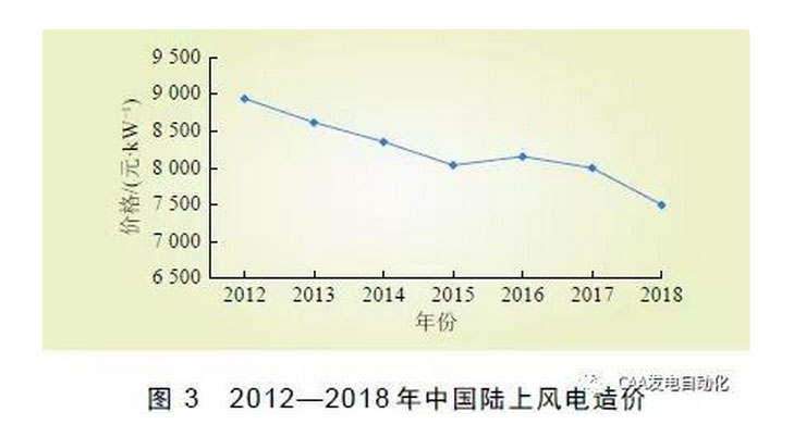 隨著中國風(fēng)電全產(chǎn)業(yè)鏈逐步實現(xiàn)國產(chǎn)化,風(fēng)電機組設(shè)計和制造技術(shù)的不斷改進,發(fā)電效率持續(xù)提升,風(fēng)電場造價和度電成本總體呈現(xiàn)逐年下降趨勢,如圖3 所示。