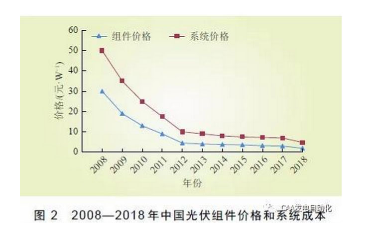 隨著光伏發(fā)電的技術(shù)進步和產(chǎn)業(yè)升級,以及市場更趨成熟,中國光伏發(fā)電成本持續(xù)下降,如圖2 所示。