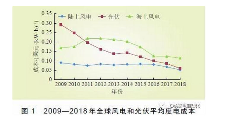 2018 年下半年,全球陸上風(fēng)電平均度電成本(levelized costof energy,LCOE)約為0.052 美元/(kW·h)(折合人民幣0.340 元/(kW·h)),比2010 年下降44 % ;海上風(fēng)電平均度電成本0 . 115 美元/(kW·h)(折合人民幣0.759 元/(kW·h)),比2010 年下降32%;全球光伏發(fā)電平均度電成本為0 . 06 美元/( k W · h) ( 折合人民幣0 . 396元/(kW·h)),比2010 年下降80%。
