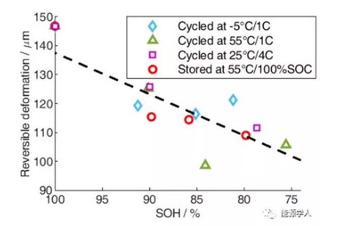 最近,歐陽明高院士團隊對-5℃/1C下循環(huán)、25℃/4C下循環(huán)、55℃/1C下循環(huán)以及55℃/100%SOC下存儲四種老化工況下的可逆和不可逆形變進行了研究。結(jié)果表明,隨著電池老化程度的增加,電池的可逆形變逐漸減小,不可逆形變逐漸增加,其中以25℃/4C下循環(huán)和55℃/100%SOC下存儲導(dǎo)致的不可逆形變最大,在80%SOH左右可分別達到總厚度的45.3%和28.8%?;谌萘吭隽糠治龊蚐EM觀察,他們確定了不同老化路徑下衰減機理和不可逆形變的原因。如25℃/4C下循環(huán)主要由于負極表面沉積物,55℃/100%SOC下存儲主要由于電解液分解導(dǎo)致的嚴重產(chǎn)氣,-5℃/1C下循環(huán)主要由于析鋰及輕微產(chǎn)氣,55℃/1C下循環(huán)主要由于SEI膜增厚。由于老化實驗中的電池是在無約束狀態(tài)下進行,他們進一步基于虛擬加載法,基于電池部件的壓縮模量,計算了在約束狀態(tài)下由于不可逆形變可能導(dǎo)致的模組中的內(nèi)應(yīng)力增加,并提出在模組中使用模量較低的聚氨酯泡沫板用以吸收電池形變,降低模組在老化后的內(nèi)應(yīng)力。這一研究成果對于指導(dǎo)模組中的機械邊界設(shè)計具有重要意義。