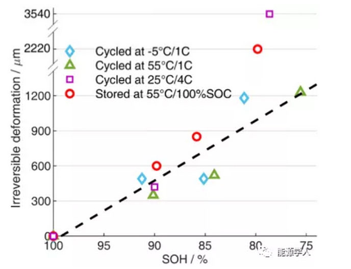 電池單體在充放電過程中會由于鋰離子嵌入/脫出電極顆粒而出現(xiàn)體積形變。這樣的形變可能會導(dǎo)致電池在模組約束條件下的內(nèi)應(yīng)力增加,從而影響電池性能。在某些內(nèi)應(yīng)力過大或過小的情況下則可能出現(xiàn)跳水現(xiàn)象。因此需要研究電池的形變規(guī)律并基于此指導(dǎo)模組設(shè)計。電池的形變可以分為可逆和不可逆兩種,可逆形變指由于脫嵌鋰、產(chǎn)熱導(dǎo)致的,可以恢復(fù)的形變;而不可逆形變指由于老化過程中的產(chǎn)氣、沉積物等原因?qū)е碌牟豢苫謴?fù)的形變。