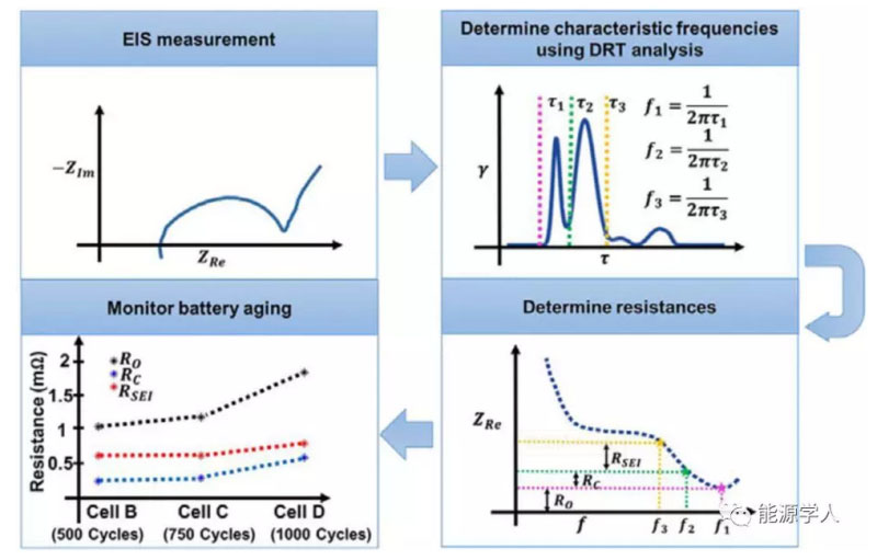 電動汽車和便攜式儲能設(shè)備的火爆發(fā)展使使得人們對于鋰離子電池的快速診斷技術(shù)需求激增。常規(guī)的鋰離子電池老化程度診斷技術(shù)是基于電化學(xué)阻抗譜實現(xiàn)的,這種方法不僅需要使用電化學(xué)工作站完成完整的阻抗譜測試,而且需要復(fù)雜的計算來提取電池相關(guān)信息。在本文中,歐陽明高院士團隊利用弛豫時間分布方法(DRT)方法對鋰離子電池電化學(xué)阻抗譜中的幾個關(guān)鍵阻抗信息進行分離后建立了一種簡便的多點阻抗診斷技術(shù)。