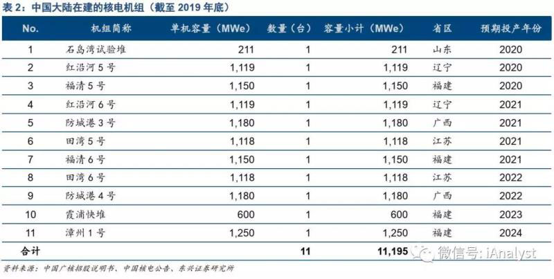截至2019年底,在建核電機(jī)組有11臺(tái),合計(jì)容量11.20GW,預(yù)計(jì)將于2020~2024年投產(chǎn),如表2所示。