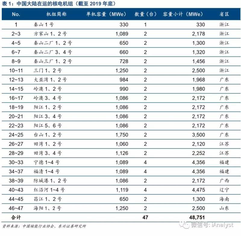 截至2019年底,我國(guó)大陸地區(qū)在運(yùn)行核電機(jī)組有47臺(tái),合計(jì)容量48.75GW,如表1所示。