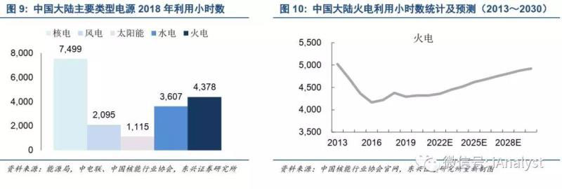我們預(yù)計(jì),未來(lái)十余年,核電年利用小時(shí)數(shù)將大概率不低于7,350h,并承擔(dān)基荷電源清潔化之大任;隨著消納進(jìn)一步改善、“平價(jià)上網(wǎng)”導(dǎo)向下項(xiàng)目選址向優(yōu)勢(shì)資源區(qū)集中、海上風(fēng)電建設(shè)加快,光伏、風(fēng)電并網(wǎng)項(xiàng)目利用小時(shí)數(shù)到2030年有望分別達(dá)到1,180h、2,240h;隨著一些小容量機(jī)組逐步關(guān)停、行業(yè)整合提效,火電利用小時(shí)數(shù)逐步回升,預(yù)計(jì)2030年達(dá)到4,920h,如圖10所示。
