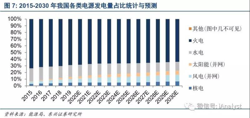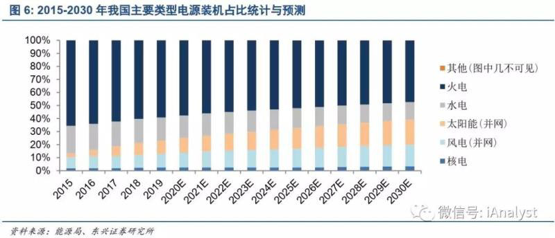 為滿足用電量增長(zhǎng)、抑制平均能耗上升的需求,發(fā)電裝機(jī)亦將持續(xù)增長(zhǎng),且清潔能源占比將進(jìn)一步提高。我們預(yù)計(jì),2020年底、2025年底、2030年底,中國(guó)大陸各類電源裝機(jī)總?cè)萘繉⒎謩e達(dá)到2,124GW、2,566GW、2,930GW,火電裝機(jī)占比分別降至57.6%、52.0%、47.3%,如圖6所示。