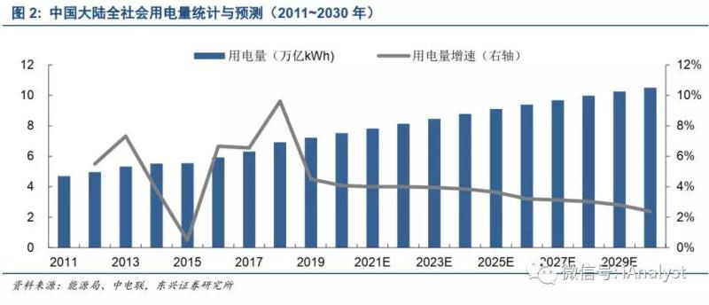 展望未來(lái)十余年,結(jié)合電能替代、工商業(yè)發(fā)展、人口增長(zhǎng)等因素的驅(qū)動(dòng),以及經(jīng)濟(jì)調(diào)結(jié)構(gòu)、控能耗等相關(guān)政策落實(shí)推進(jìn),我們預(yù)計(jì),2020年、2025年、2030年,中國(guó)大陸全社會(huì)用電量將分別達(dá)到7.52萬(wàn)億kWh、9.10萬(wàn)億kWh、10.50萬(wàn)億kWh,2019~2025年、2025~2030年的年均復(fù)合增速分別為3.92%、2.90%,如圖2所示。