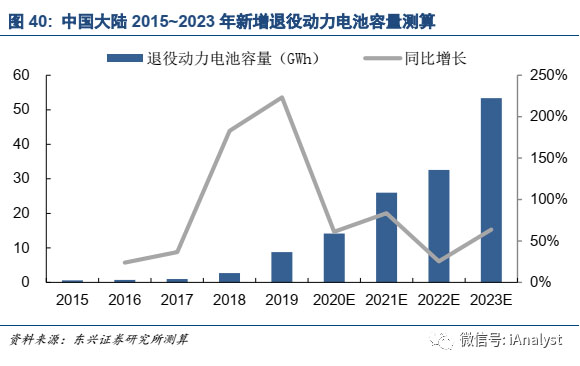 隨著鋰電系新能源汽車加大推廣,動力電池退役后的管理問題被提上議事日程。我們預(yù)估,2015~2019年期間步入退役期(含已處理)的動力電池不足15GWh,而2020~2023年期間預(yù)計將累計新增超過120GWh退役動力電池,如圖40所示。