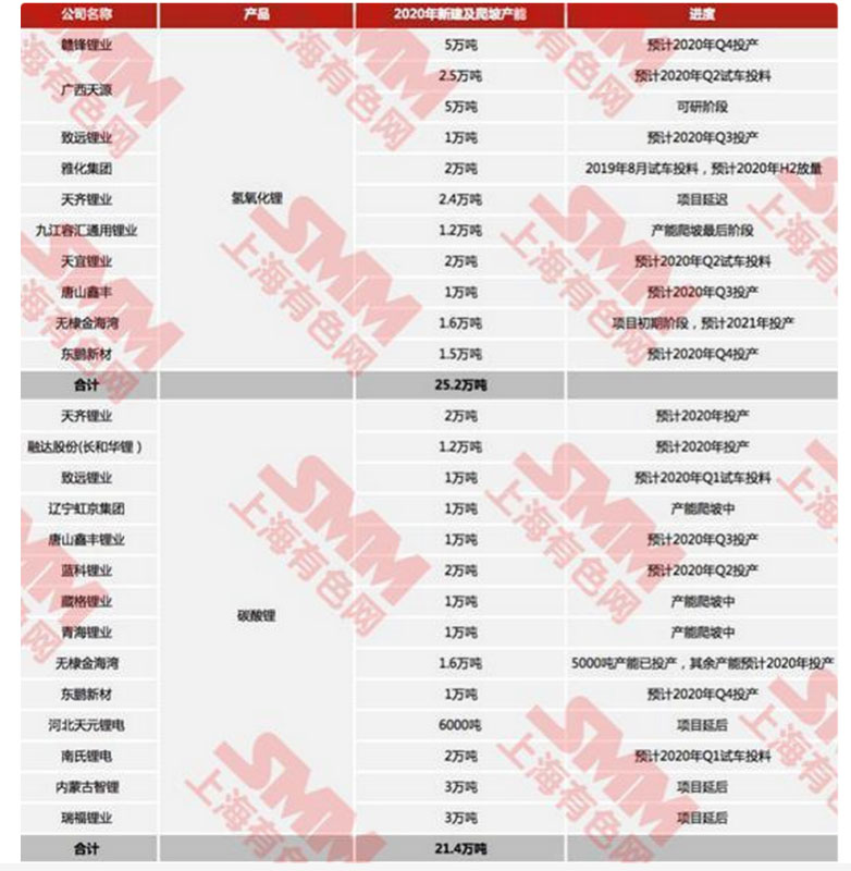 據(jù)SMM統(tǒng)計(jì),2019年中國(guó)碳酸鋰產(chǎn)量為15.9萬(wàn)噸,中國(guó)氫氧化鋰產(chǎn)量為7.6萬(wàn)噸。隨著年初國(guó)內(nèi)新能源汽車(chē)市場(chǎng)釋放相關(guān)利好政策,以及特斯拉國(guó)產(chǎn)化進(jìn)程的加快,2020年國(guó)內(nèi)上游鋰鹽廠(chǎng)新建產(chǎn)能數(shù)量以及進(jìn)度情況,尤其是國(guó)內(nèi)氫氧化鋰產(chǎn)能的建設(shè)情況受到全行業(yè)關(guān)注。對(duì)此我們總結(jié)如下: