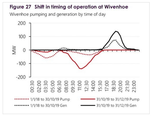 澳大利亞能源市場運營商(AEMO)指出,太陽能電力過剩期間的泵送量增加。在2019年11月,Wivenhoe抽水蓄能抽水時間達到83%,與2019年10月的20%相比顯著增加。