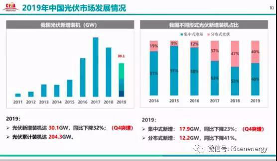據(jù)統(tǒng)計,2019年光伏新增裝機30.1GW,同比下降32%,光伏累計裝機達到203.3GW。其中,集中式光伏新增裝機17.9GW,分布式光伏新增裝機12.2GW。