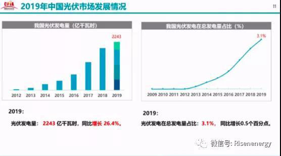 此外,2019年光伏發(fā)電量2243億千瓦時,同比增長26.4%,占總發(fā)電量3.1%,同比增長0.5個百分點。