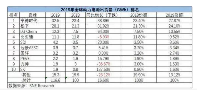 不久前,韓國SNE Research發(fā)布了2019年全球鋰離子動力電池出貨量榜單,從整體數(shù)據(jù)來看,去年全球整體鋰離子動力電池總出貨量為116.6GWh,同比增長16.6%,并且在前10名中,中國電池廠商占據(jù)了5個(gè)席位,相較2018年減少了2個(gè)。