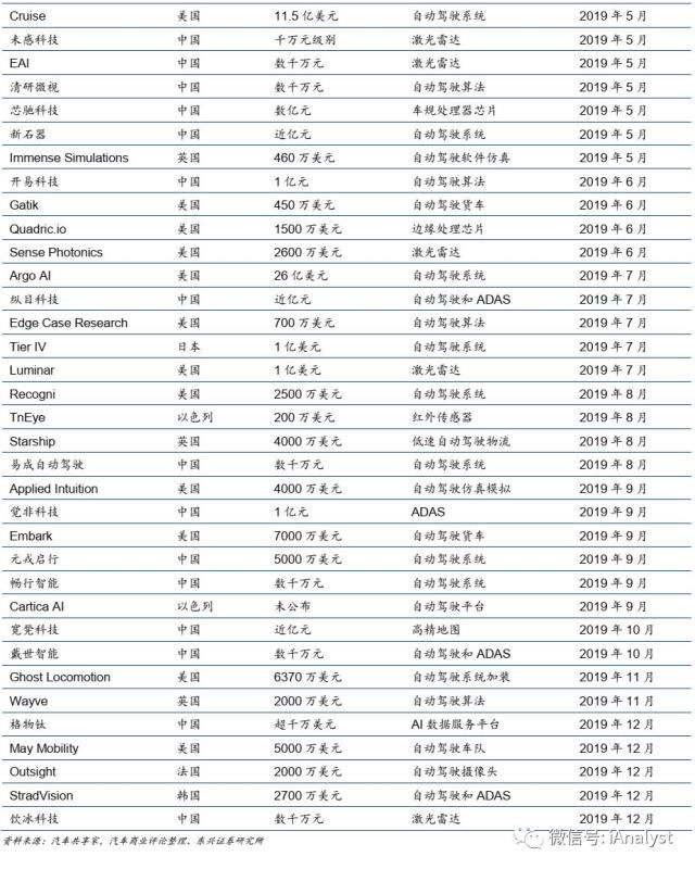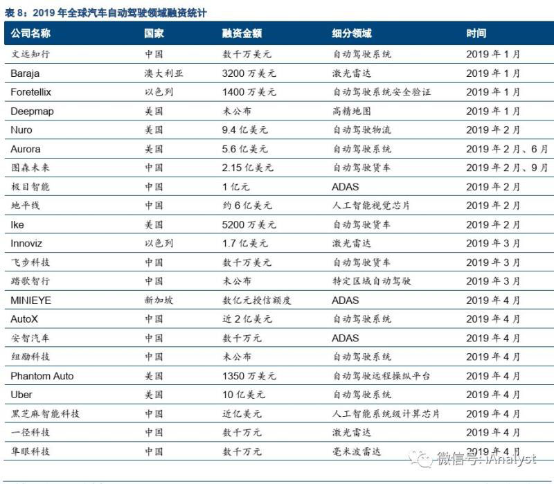 電動化賦予新能源汽車生命,而智能化的自動駕駛將為新能源汽車賦予更多附加值。實現(xiàn)自動駕駛的新能源汽車將迎來類似于智能手機對傳統(tǒng)手機的替代的過程,由市場供給引導(dǎo)需求變化。而電動汽車的整體結(jié)構(gòu)與系統(tǒng)設(shè)計,更便于搭載自動駕駛系統(tǒng)。從2019年全球范圍汽車自動駕駛相關(guān)領(lǐng)域融資情況(如表8所示)來看,自動駕駛領(lǐng)域的創(chuàng)業(yè)項目受到資本青睞,建議長期關(guān)注這一領(lǐng)域的科技進(jìn)展與產(chǎn)業(yè)化落地。