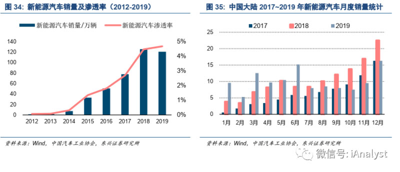 我國新能源汽車的購置補貼從2009年開始,伴隨著人們對新能源汽車接受度的逐漸提升,以及充電樁等配套設(shè)施的完善,2014~2015年新能源汽車產(chǎn)銷出現(xiàn)了爆發(fā)式增長。中國汽車工業(yè)協(xié)會數(shù)據(jù)表明,2014和2015年新能源汽車銷量分別為7.48萬輛和33.11萬輛,分別同比增長3.24倍和3.43倍;2016~2018年銷量增速都維持在50%以上;2019年在新增車輛中的滲透率達(dá)到4.68%,如圖34所示。