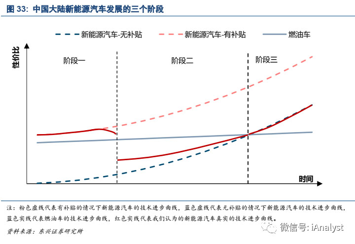 新能源汽車是相對于傳統(tǒng)燃油車而言的,其本質(zhì)是汽車驅(qū)動力由化石燃料向電力的轉(zhuǎn)換。因為化石燃料和內(nèi)燃機作為交通工具主要的驅(qū)動力已經(jīng)有一百多年歷史,其變革需要技術(shù)進(jìn)步、政策推動、出行習(xí)慣改變等多方面共同努力,這就決定了新能源汽車替代傳統(tǒng)燃油車的進(jìn)程是一個漫長的過程。我們認(rèn)為在傳統(tǒng)燃油車主導(dǎo)的時代,新能源汽車的發(fā)展或經(jīng)歷三個階段。如圖33所示。
