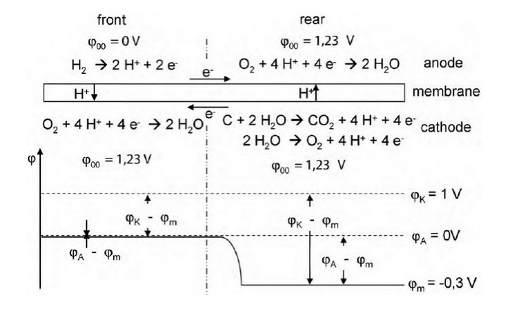以實際車用Mirai電堆開發(fā)為例,為避免陰極水淹現(xiàn)象,陰極進氣通常不加濕,而選擇陽極進氣加濕(氫氣循環(huán)泵或引射器)。氫氣加濕后,混合氣溫度較高,遇到溫度較低的管道,一部分水蒸氣會凝結成液態(tài)水,殘留在管道內(nèi)部。汽車怠速工況工作時(如長時間等待或交通堵塞),為保證較低燃料消耗率,此時電堆溫度會下降,同時ECU會配給電堆較低的氫氣量。一旦液態(tài)水流入電池陽極流道,液態(tài)水將很難排出。與陰極不同,當陽極氫氣無法進入催化劑層,而外部又要求供電,陰極催化劑碳載體會被反應消耗,對催化劑層造成不可逆的損傷(此時電壓為負壓)。在此過程還會有一氧化碳生成,造成催化劑中毒。若反應持續(xù)進行,還會在陰極發(fā)生水電解現(xiàn)象。