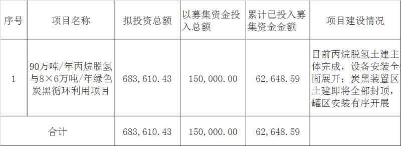 據(jù)了解,90 萬(wàn)噸/年丙烷脫氫與 8×6 萬(wàn)噸/年綠色炭黑循環(huán)利用項(xiàng)目投資總額為68.36億元,其中15億來(lái)源于募集資金(公司 2019 年 10 月通過(guò)公開(kāi)發(fā)行 1500 萬(wàn)張可轉(zhuǎn)換公司債券,募集所得)。其余部分由公司自籌。