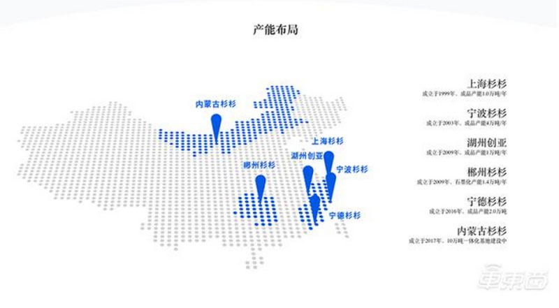 到目前為止,杉杉股份共擁有上海杉杉、寧波杉杉、湖州創(chuàng)亞、郴州杉杉、寧德杉杉、內(nèi)蒙古杉杉六大負(fù)極材料生產(chǎn)基地,產(chǎn)能達(dá)到8萬噸/年,在EVTank的統(tǒng)計中排名全球第三。