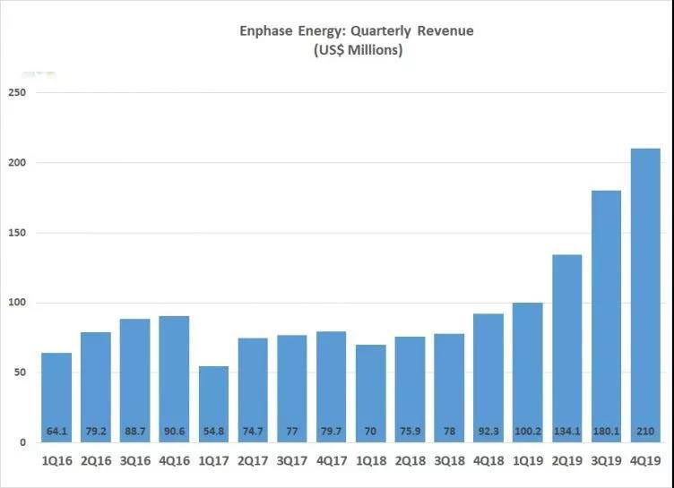 圖片:2016-2019年Enphase季度銷售額柱狀圖,2019年銷售額超過(guò)6.24億美元 來(lái)源:PV-Tech