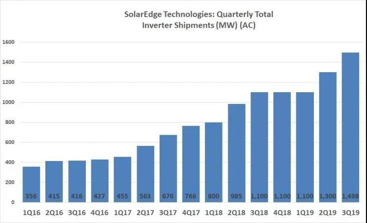 圖片:2016-2019年Solaredge季度出貨量柱狀圖,全年出貨接近6GW 來(lái)源:PV-Tech