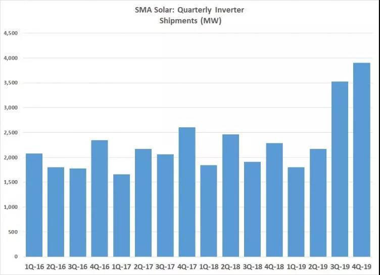 圖片:2016-2019年SMA季度出貨量柱狀圖 來(lái)源:PV-Tech