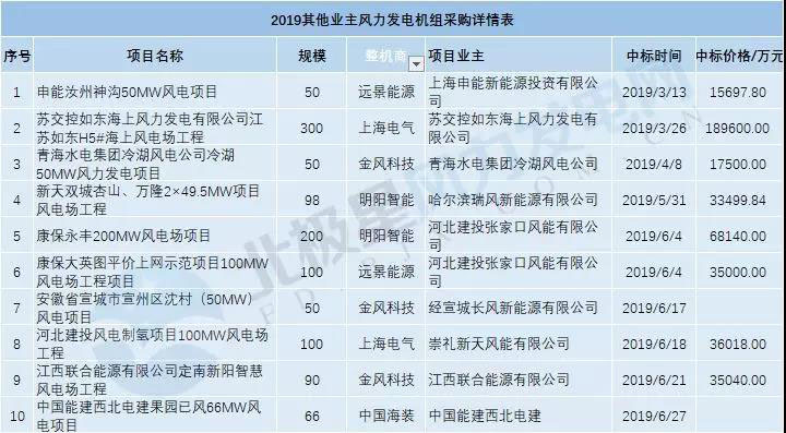 其中,金風科技中標6個風電項目,中標項目規(guī)模615MW,中標金額為263115.98萬元;遠景能源中標10個風電項目,中標項目規(guī)模706.9MW,中標金額為260706.85萬元;明陽智能中標4個風電項目,中標項目規(guī)模462.6MW,中標金額為125939.84萬元;上海電氣中標5個風電項目,中標項目規(guī)模749.5MW,中標金額為667981.5萬元;中國海裝中標4個風電項目,中標項目規(guī)模516MW,中標金額為166375萬元;湘電風能中標4個風電項目,中標項目規(guī)模235MW,中標金額為107432萬元;中車株洲所中標1個風電項目,中標項目規(guī)模15MW,中標金額為6106.625萬元;維斯塔斯中標1個風電項目,中標項目規(guī)模200MW,中標金額為79652.16萬元;東方風電中標1個風電項目,中標項目規(guī)模50MW;運達風電中標3個風電項目,中標項目規(guī)模280MW,中標金額為98000萬元;GE中標3個風電項目,中標項目規(guī)模100MW,中標金額為34914.5萬元;山東中車中標個風電項目,中標項目規(guī)模100MW,中標金額為37406.26萬元。以下為其他風電業(yè)主部分項目采購情況表。