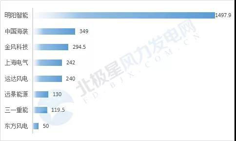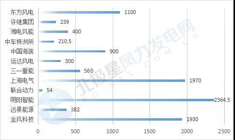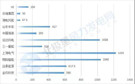 其中,金風科技中標3個風電項目,中標項目規(guī)模590MW,中標總訂單金額為413442.67 萬元;遠景能源中標7個風電項目,中標項目規(guī)模617.5MW,中標總訂單金額為277612.20 萬元;明陽智能中標6個風電項目,中標項目規(guī)模1040MW,中標總訂單金額為520262.61 萬元;上海電氣中標4個風電項目,中標項目規(guī)模1225MW,中標總訂單金額為782653.14 萬元;運達風電中標7個風電項目,中標項目規(guī)模1028MW,中標總訂單金額為404246.01 萬元;中國海裝中標5個風電項目,中標項目規(guī)模250MW,中標總訂單金額為132226.53 萬元;三一重能中標7個風電項目,中標項目規(guī)模318MW,中標總訂單金額為141240.00萬元;山東中車中標5個風電項目,中標項目規(guī)模417MW,中標總訂單金額為195690.66萬元;許繼風電中標1個風電項目,中標項目規(guī)模50MW,中標總訂單金額為23679.13 萬元;湘電風能中標47.5個風電項目,中標項目規(guī)模18920.56 MW,中標總訂單金額為195690.66萬元;GE中標1個風電項目,中標項目規(guī)模150MW,中標總訂單金額為60763.40 萬元;