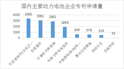 比亞迪公司作為車企,因其涉及動(dòng)力電池以外的相關(guān)專利較多,如汽車發(fā)動(dòng)機(jī)、傳動(dòng)系統(tǒng)、整車制造、太陽能電池等,本次以公式①“ALL_AN:(比亞迪) AND TAC:(電池) NOT TAC:(太陽能)”作為檢索方法,檢索其專利數(shù)據(jù),結(jié)果顯示,比亞迪涉及動(dòng)力電池方面(非太陽能電池)的專利申請(qǐng)量為3365項(xiàng)。同期,國(guó)軒高科和寧德時(shí)代的專利,主要集中在與動(dòng)力電池相關(guān)的產(chǎn)業(yè)鏈技術(shù)上,其檢索結(jié)果顯示,國(guó)軒高科和寧德時(shí)代已公開可查詢的專利申請(qǐng)量分別為2931和2901項(xiàng)。另外,天津力神、中航鋰電、億緯鋰能和比克電池公開的專利申請(qǐng)量,分別為1899項(xiàng)、639項(xiàng)、579項(xiàng)和519項(xiàng)。