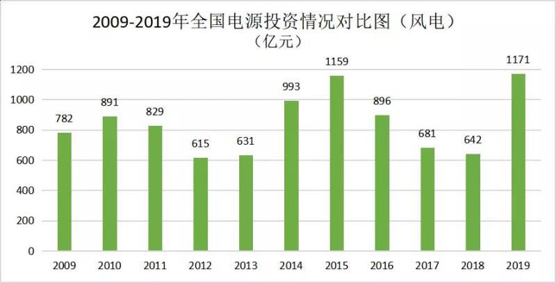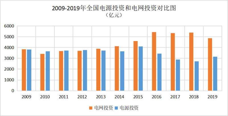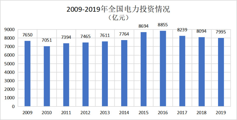 2019年,全國電力投資累計7995億元,同比下降2.0%。其中,電源投資3139億元(其中:水電814億元、火電630億元、核電335億元、風(fēng)電1171億元);電網(wǎng)投資4856億元。