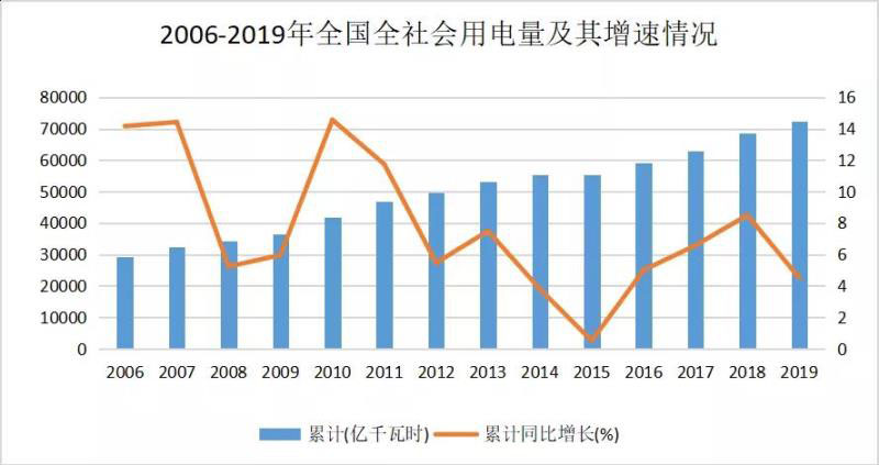 2019年,全國全社會用電量累計72255億千瓦時,同比增長4.5%。