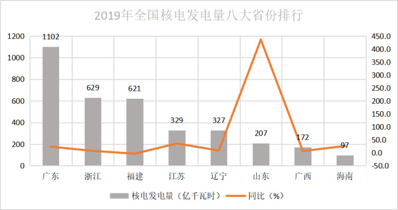 2019年,全國核電發(fā)電八大省份的發(fā)電量分別是:廣東1102億千瓦時、浙江629億千瓦時、福建621億千瓦時、江蘇329億千瓦時、遼寧327億千瓦時、山東207億千瓦時、廣西172千瓦時、海南97億千瓦時。