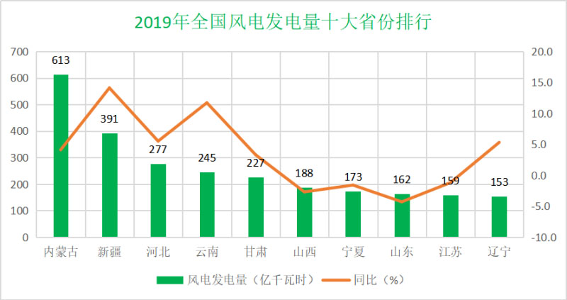 2019年,全國風(fēng)電發(fā)電量排行前十的省份分別是:內(nèi)蒙古612.8億千瓦時、新疆391.4億千瓦時、河北277.3億千瓦時、云南245.3億千瓦時、甘肅226.9億千瓦時、山西188.1億千瓦時、寧夏173億千瓦時、山東162.4億千瓦時、江蘇158.6億千瓦時、遼寧153.1億千瓦時。