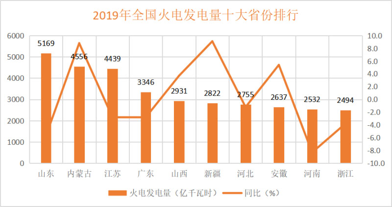 2019年,全國火電發(fā)電量排行前十的省份分別是:山東5169億千瓦時、內(nèi)蒙古4556億千瓦時、江蘇4439億千瓦時、廣東3346億千瓦時、山西2931億千瓦時、新疆2822億千瓦時、河北2755億千瓦時、安徽2637億千瓦時、河南2532億千瓦時、浙江2494億千瓦時。
