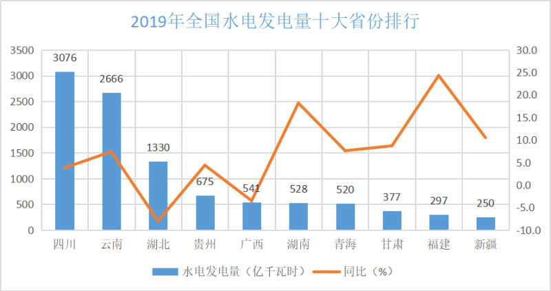 2019年,全國水電發(fā)電量排行前十的省份分別是:四川3076億千瓦時、云南2666億千瓦時、湖北1330億千瓦時、貴州675億千瓦時、廣西541億千瓦時、湖南528億千瓦時、青海520億千瓦時、甘肅377億千瓦時、福建297億千瓦時、新疆250億千瓦時。