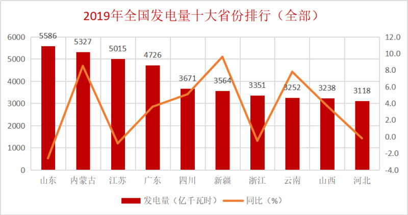 2019年,全國發(fā)電量排行前十的省份分別是:山東5586億千瓦時、內(nèi)蒙古5327億千瓦時、江蘇5015億千瓦時、廣東4726億千瓦時、四川3671億千瓦時、新疆3564億千瓦時、浙江3351億千瓦時、云南3252億千瓦時、山西3238億千瓦時、河北3118億千瓦時。