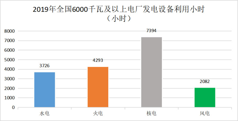 2019年,全國6000千瓦及以上電廠發(fā)電設(shè)備累計平均利用小時為3825小時。其中,水電3726小時、火電4293小時、核電7394小時、風(fēng)電2082小時。