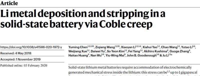 "Li metal deposition and stripping in a solid-state battery via Coble creep", Nature (2020) 10.1038/s41586-020-1972-y.