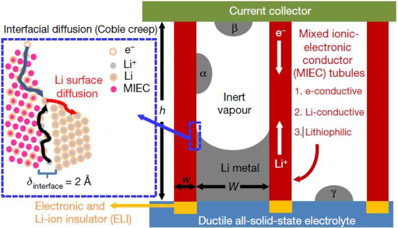 研究人員開(kāi)發(fā)出一種六邊形的 MIEC 管蜂窩狀陣列的三維納米結(jié)構(gòu),并在該結(jié)構(gòu)中的一部分注入了固態(tài)鋰金屬以形成電池的一個(gè)電極,但每根管內(nèi)都留有多余的空間。當(dāng)鋰在充電過(guò)程中膨脹時(shí),它會(huì)在依然保持其固態(tài)晶體結(jié)構(gòu)的同時(shí),還可以像液體一樣流入管內(nèi)部的空白區(qū)域。這種流動(dòng)被完全限制在蜂窩狀結(jié)構(gòu)之中,既能在充電引起膨脹時(shí)減輕壓力,又不會(huì)改變電極的外部尺寸或電極與電解質(zhì)之間的邊界。ELI 也如李巨教授解釋得一般,是 MIEC 外壁和固體電解質(zhì)層之間的關(guān)鍵機(jī)械粘合劑。