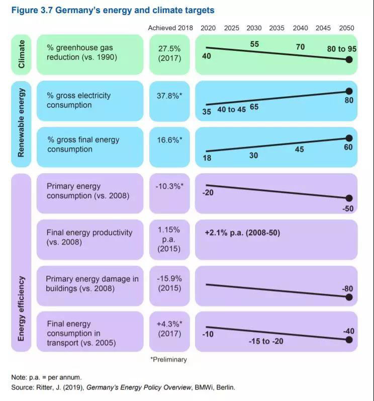 國際能源署發(fā)布德國能源政策評估報告,其中匯總了德國能源轉(zhuǎn)型各項目標(biāo)的進(jìn)展數(shù)據(jù):