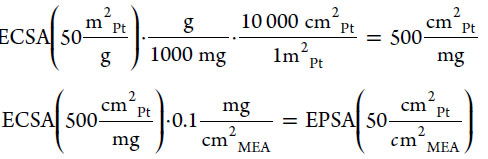 通用汽車公司2016年發(fā)表的一篇文章中對(duì)此進(jìn)行了重要討論,證明了EPSA對(duì)氧氣傳輸損失現(xiàn)象的至關(guān)重要性,并突出了開(kāi)發(fā)高電化學(xué)活性面積催化劑的重要性,如上圖所示。具體來(lái)說(shuō),EPSA是鉑族金屬催化劑擔(dān)載量(mg PGM/cm2 MEA)和ECSA(m2/g)的乘積。鉑族金屬催化劑擔(dān)載量是美國(guó)能源部在成本要求下提出的2020年鉑族金屬催化劑擔(dān)載量目標(biāo)值0.125 mg/cm2。通用汽車公司在研究中設(shè)定陽(yáng)極擔(dān)載量為0.025 mg/cm2(可實(shí)現(xiàn)的最低擔(dān)載量,在不損失氫氧化動(dòng)力學(xué)性能前提下),陰極鉑族金屬催化劑擔(dān)載量則只能為0.1 mg/cm2。在此目標(biāo)擔(dān)載量下,上圖中的x軸可以直接轉(zhuǎn)換為催化劑電化學(xué)活性面積。以下公式給出了一個(gè)示例,假設(shè)催化劑目標(biāo)擔(dān)載量為0.1 mg/cm2時(shí)電化學(xué)活性面積為50 m2/g。