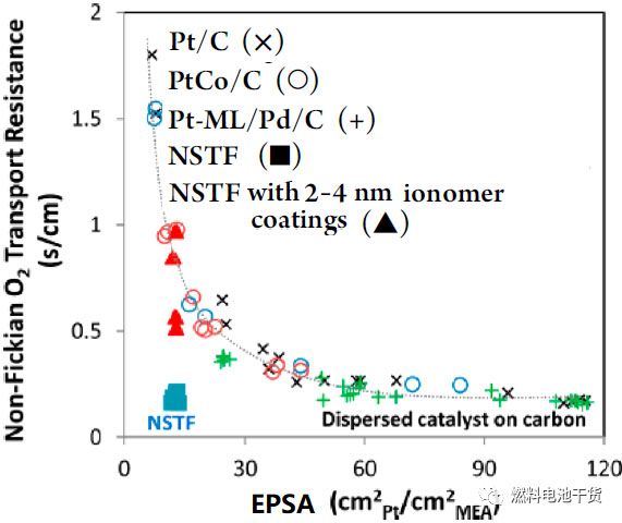 盡管目前電化學(xué)活性面積這一參數(shù)尚未在美國(guó)能源部的燃料電池電催化劑技術(shù)目標(biāo)里出現(xiàn),但顯然如果要實(shí)現(xiàn)<0.1 mg PGM/cm2的陰極催化劑擔(dān)載量目標(biāo),電化學(xué)活性面積也是一個(gè)關(guān)鍵參數(shù)。具體來(lái)說(shuō),目前已廣泛報(bào)道,當(dāng)EPSA(實(shí)際鉑表面積/MEA幾何表面積)達(dá)到<?50 cm2 Pt/cm2 MEA時(shí),電流密度>1.5 A/cm2下觀察到的性能損失超過(guò)傳統(tǒng)的巴特勒-沃爾默動(dòng)力學(xué)所預(yù)測(cè)的損失,這種額外的性能損失是氧氣通過(guò)覆蓋催化劑表面的聚合物膜時(shí)傳輸阻力引起的。隨著EPSA降低,每個(gè)催化劑顆粒上的局部氧氣通量會(huì)大大增加,導(dǎo)致傳輸阻力的局部升高。